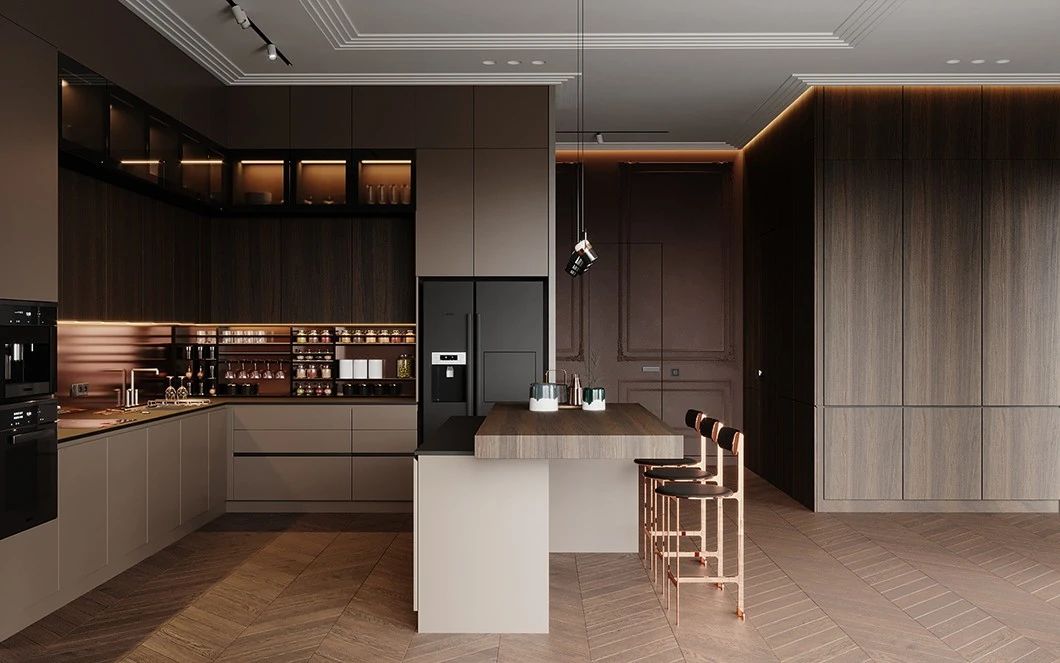 第二,吊掛式櫥柜的下方需要加設燈具,因為櫥柜會遮擋光線,形成暗角。采用燈帶或者小型射燈增加梅柜下方工作區(qū)的照度就可以。